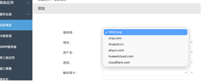 - 选择添加新的DDNS服务提供商:选“阿里云”或者“Aliyun DDNS”(如果没有,就选自定义DNS API那种)。