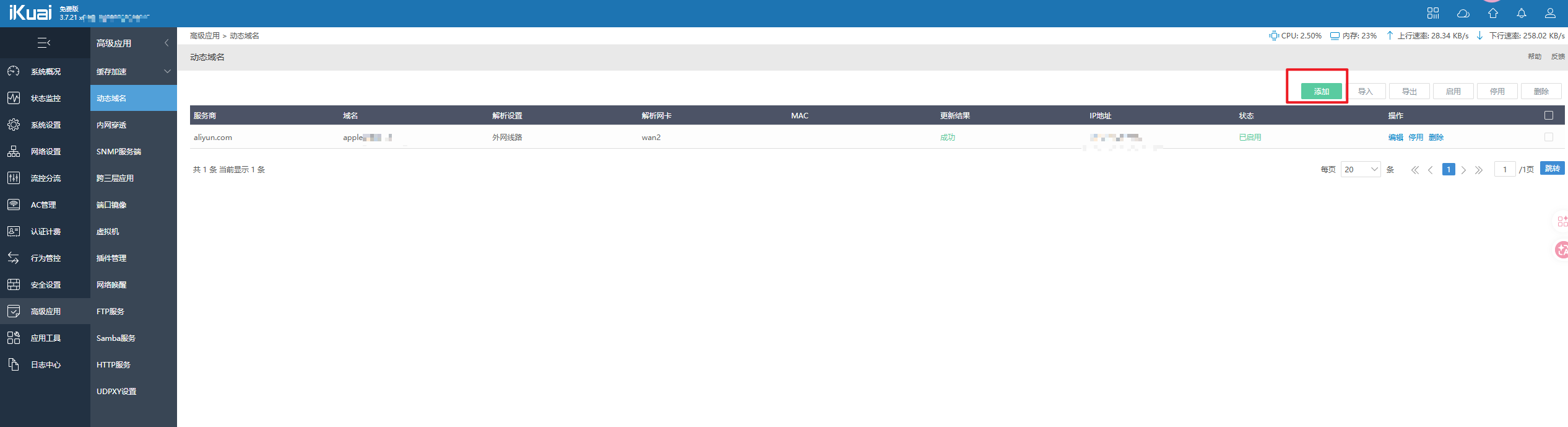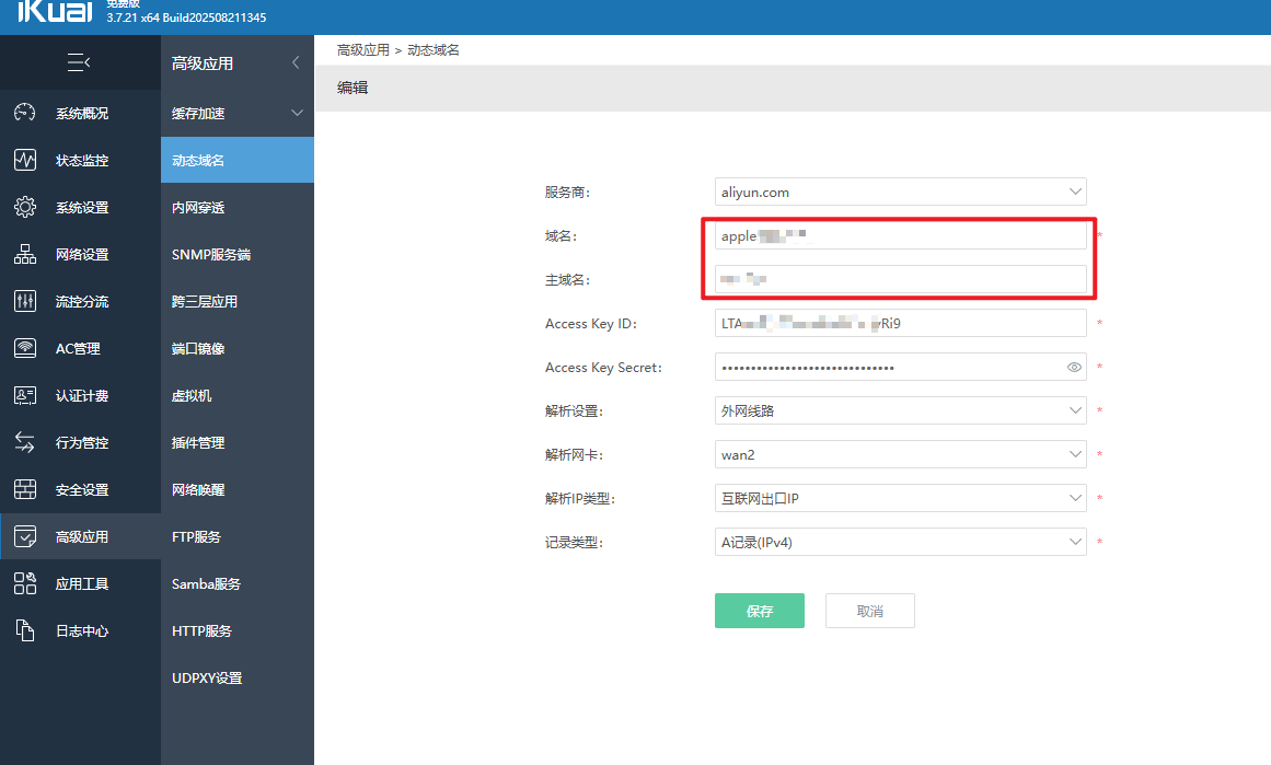 准备工作:你得有个阿里云账号,已经买好了域名(比如*.apple-lab.cn),并且在阿里云控制台添加了A记录或CNAME啥的。iKuai路由器也得是支持DDNS的版本(大部分都是)。OK,下面进入正题。