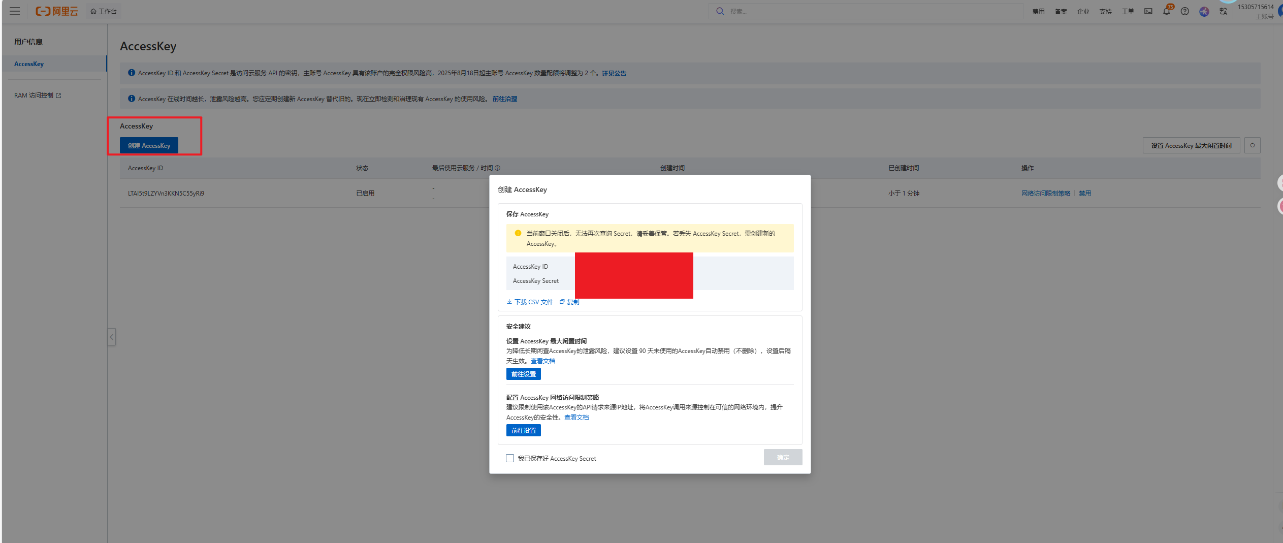 - 点击“创建Access Key”,系统会生成一对:Access Key ID 和 Access Key Secret。这两个就是你的“钥匙”,记下来,别泄露哦!(我建议用密码管理器存着,安全第一。)
