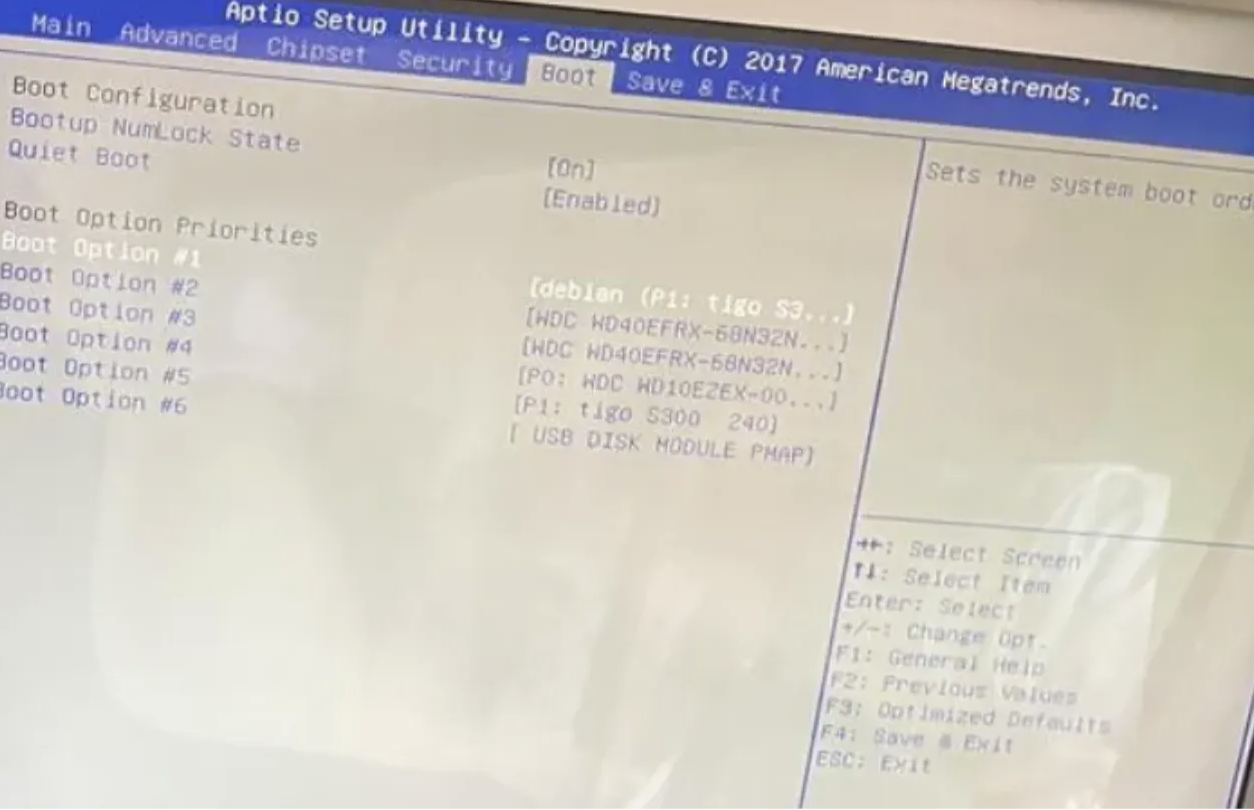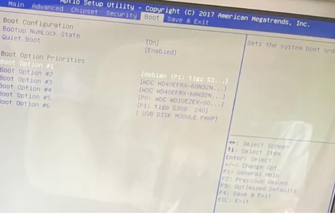 我这里是F2进入的Bios,这个界面熟悉吧,就是BIOS引导界面,这里记得把要装的飞牛系统硬盘放第一位,那个USB DISK是威联通官方的引导,这个移动到最下面即可,这样,我们就能正常引导安装系统了,如果你之前没有系统,全新的空盘,这里记得把你的USB安装系统的镜像盘放第一个,这样开机直接就能安装系统了