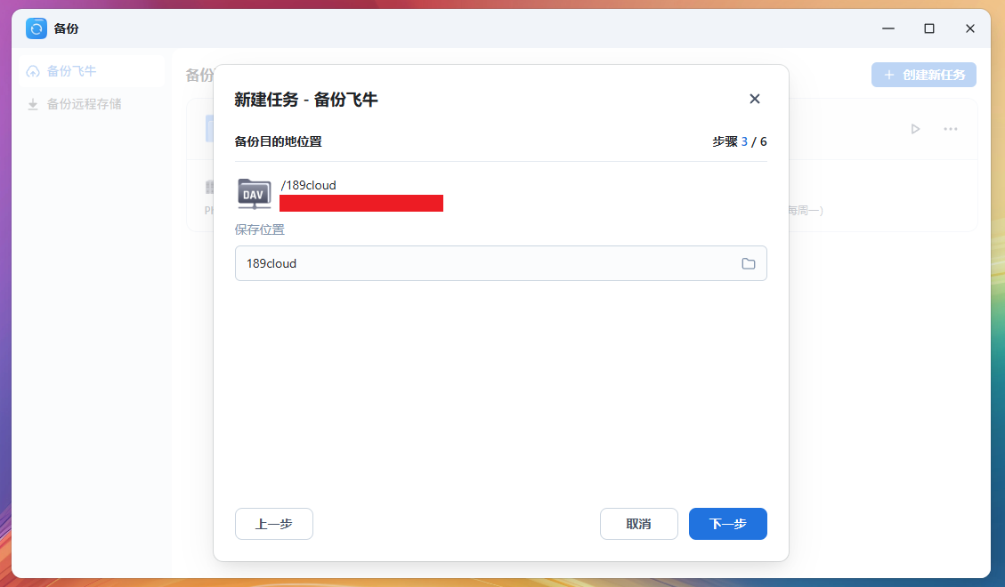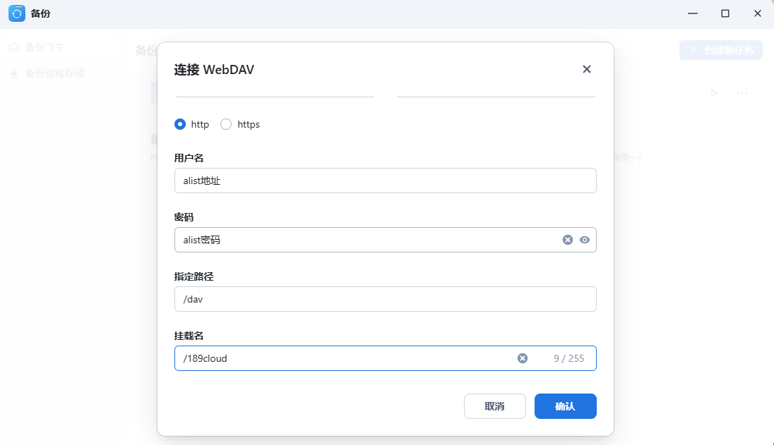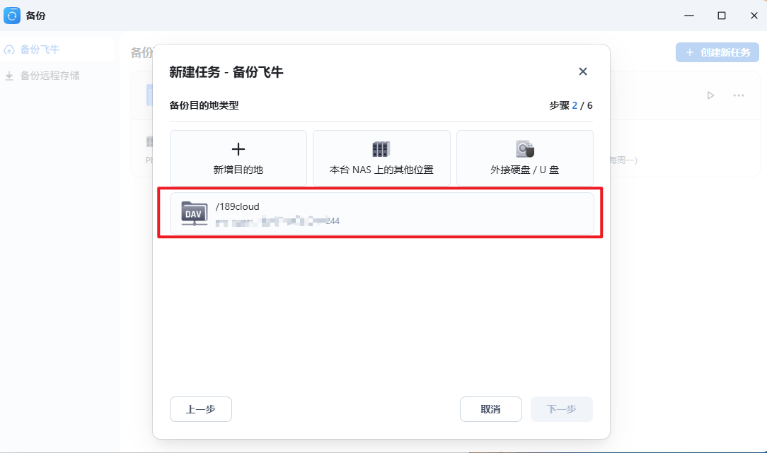下一步开始备份任务,首先是提示我们的挂载目录,如果没显示,就说明alist设置不对,需要在挂载的时候重新修改