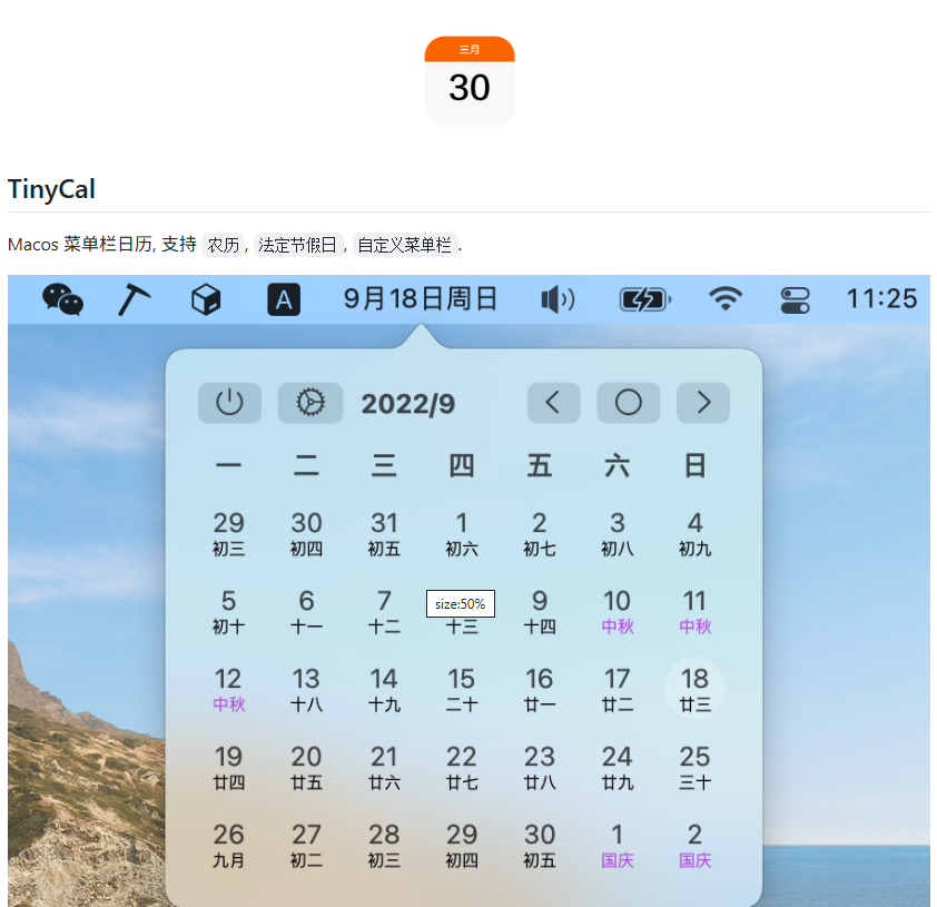 官网直达daodao97/TinyCal: macos 菜单栏日历