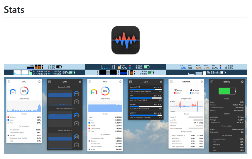 想知道电脑为什么突然风扇狂转? Stats 可以在屏幕顶部的菜单栏实时显示 CPU、内存、磁盘、网速、电池温度等信息。相比于收费的 iStat Menus,它完全开源免费,且界面精致。